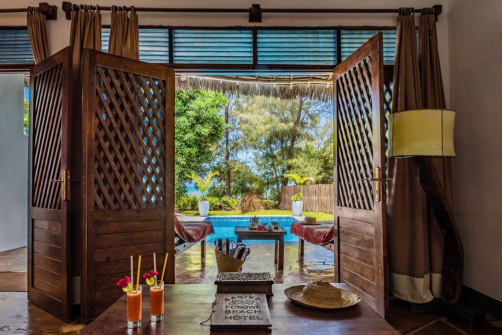 • Very short walk to the beach (approx. 30 seconds) from some garden rooms. Pongwe Beach HotelIf you prefer more privacy, a more peaceful setting, and are okay with being slightly farther from the beach than the beachfront rooms. Good for families or friends wanting a mix of quiet + beach access. Sea View Suite • Spacious suite with views over the sea. Pongwe Beach Hotel